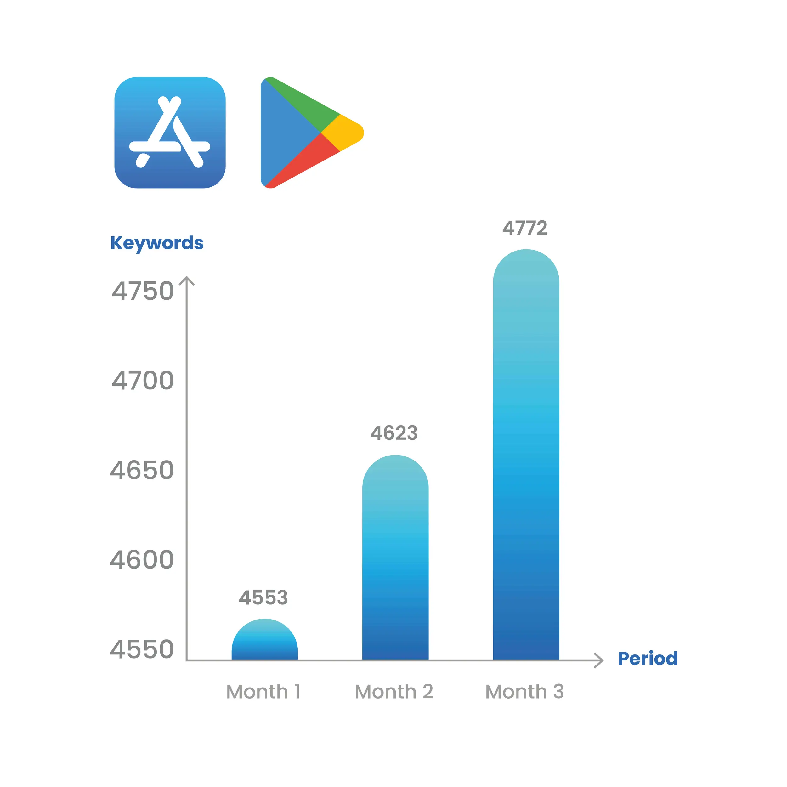 With ASO and A/B testing, we boosted keyword rankings by up to 77% and added over 100 new keywords per month across App Store and Google Play